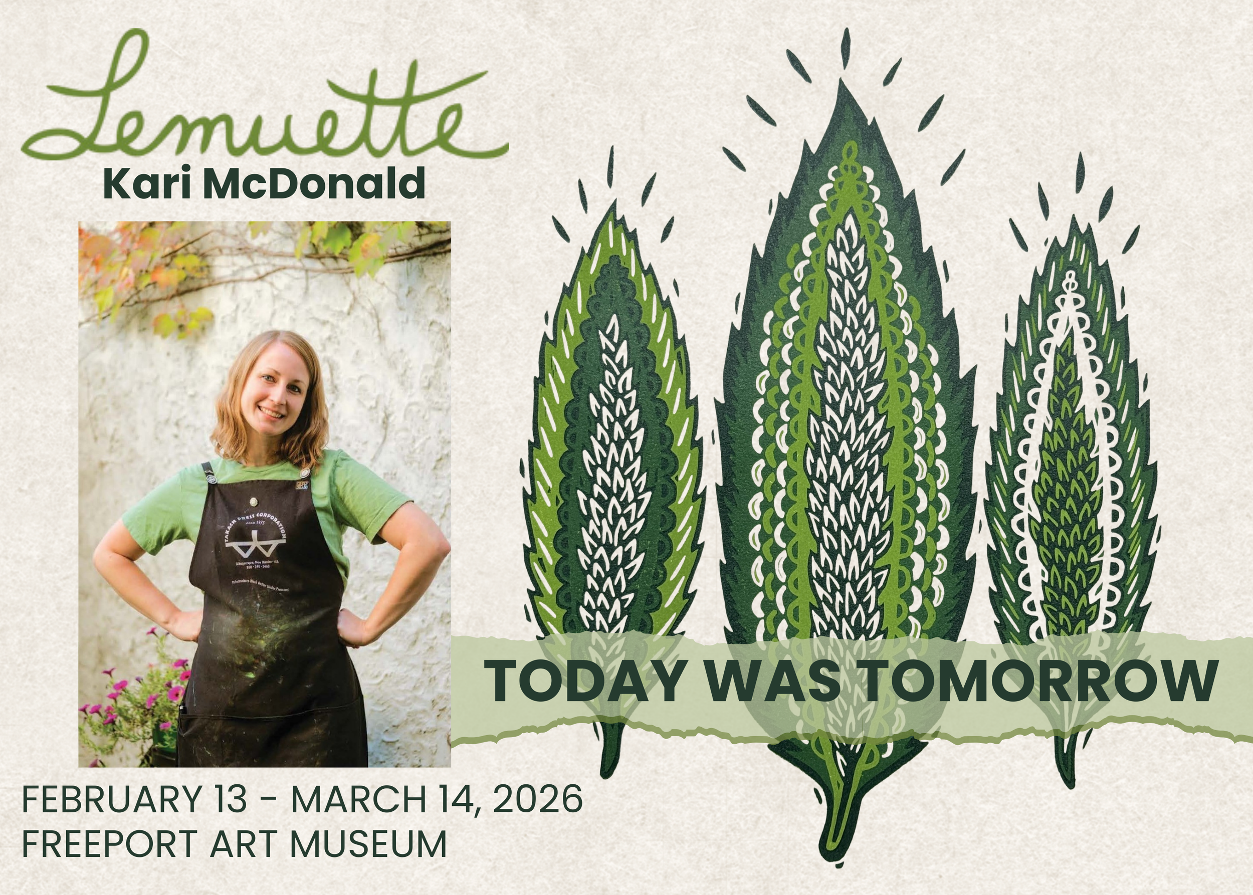 Today Was Tomorrow, a solo exhibition by Rockford-based printmaker Kari McDonald—also known by her artistic moniker Lemuette—will kick off FAM’s 2026 exhibition season. Known for her meditative, nature-inspired woodblock prints featuring prairie plants, whimsical blooms, and charming little critters, Kari invites viewers to slow down and find a moment of calm. This new body of work blends hand-carved woodblock, letterpress, and screen printing to explore presence, prairie landscapes, and the beauty that can emerge even through challenging seasons.